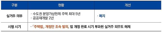 수도권 분양가 상한제 주택과 공공재개발 일반분양분에 적용되던 2~5년 실거주 의무를 전면 폐지한다. 또한 이를 소급 적용하기로 해서 논란의 여지가 있다. 다만 주택 실거주 의무 폐지는 주택법 개정 사항으로 국회 통과가 필요하므로 이후 국회 일정을 지켜봐야 한다.