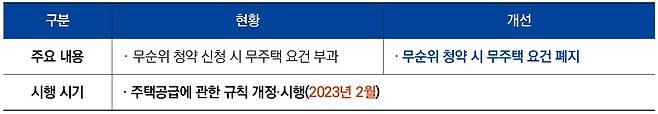 주택 소유자도 무순위 청약 신청이 가능하도록 개선한다. 무순위 청약자격 요건 중 ‘무주택 요건’을 폐지한다.