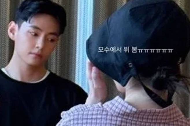 공개된 사진 속 뷔는 군복무 중 휴가를 나온 듯한 모습이며, 뷔 맞은 편에는 분홍색 체크 셔츠, 벙거지 모자를 쓴 여성이 앉아 있습니다.
