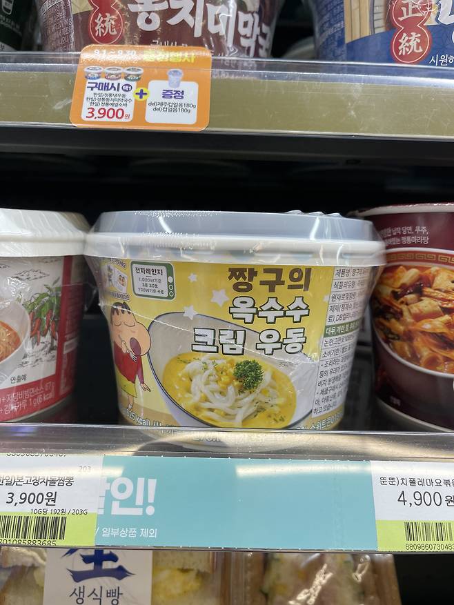 옥수수 플레이크, 크림소스, 버터 등이 어우러져 달콤하면서도 부드러운 풍미가 강조된 우동 제품이에요.