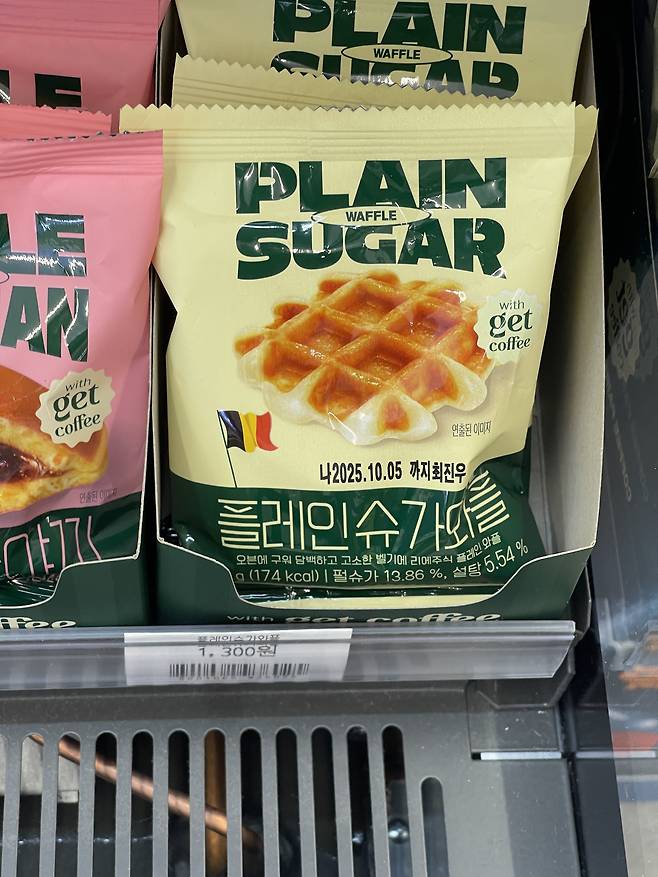 CU 플레인슈가와플은 1,300원에 즐길 수 있는 달콤한 설탕 코팅의 기본 와플로, 커피와 잘 어울리는 디저트에요.