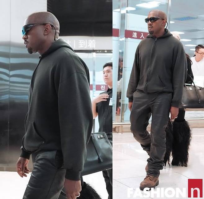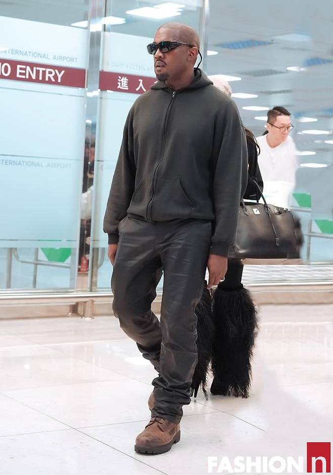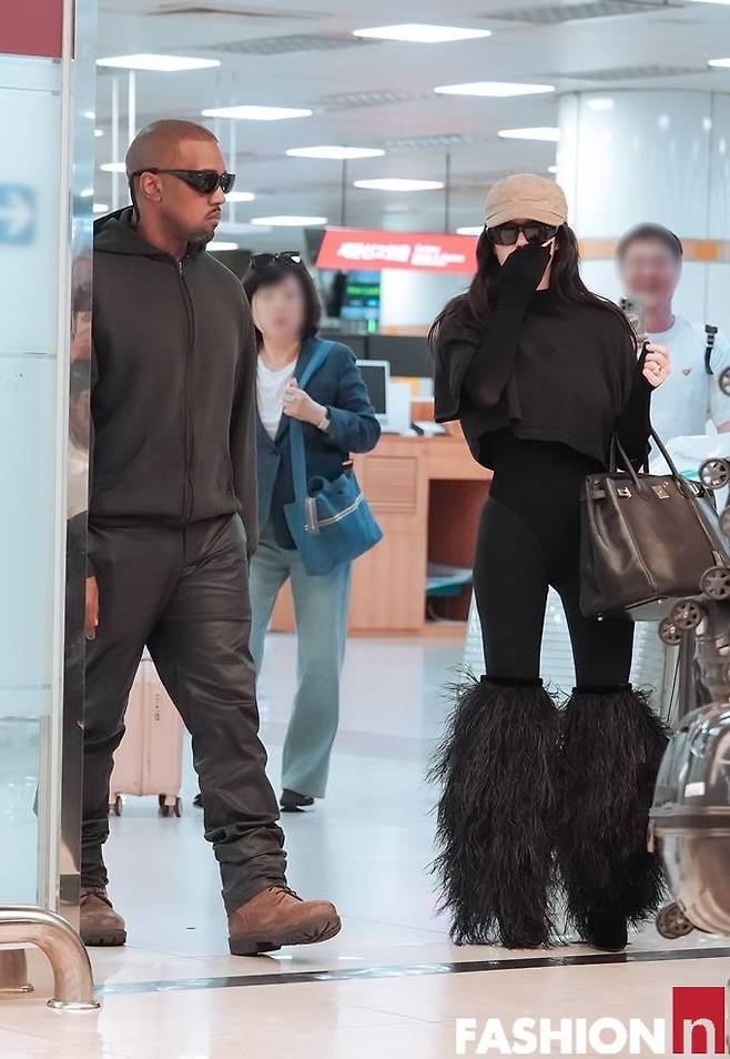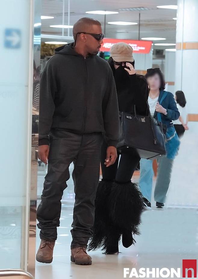 칸예예 웨스트는 블랙 가죽 팬츠와 후드 집업을 매치한 힙한 캐주얼룩, 아내 비앙카는 블랙 깃털 디테일이 눈에 띄는 블랙 나팔 바지를 비롯한 올블랙 꽁꽁패션으로 입국했다.