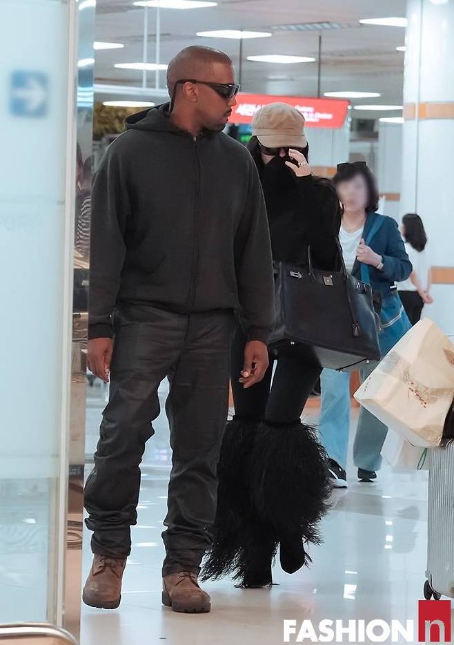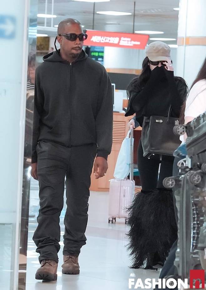 칸예예 웨스트는 블랙 가죽 팬츠와 후드 집업을 매치한 힙한 캐주얼룩, 아내 비앙카는 블랙 깃털 디테일이 눈에 띄는 블랙 나팔 바지를 비롯한 올블랙 꽁꽁패션으로 입국했다.