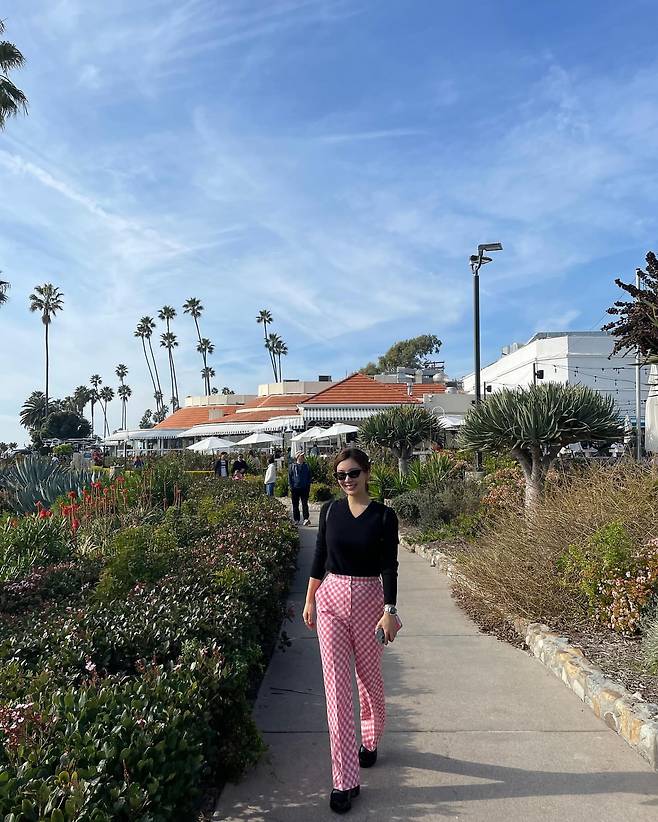 함연지는 야외 산책길에서 블랙 니트와 핑크 체크 팬츠를 매치해 경쾌하면서도 세련된 리조트룩을 연출하고 있다. 심플한 블랙 상의와 화려한 팬츠의 조화가 돋보이며, 블랙 슈즈와 손목시계로 포인트를 더했다. 자연스러운 헤어스타일과 미니멀한 액세서리로 전체적으로 깔끔한 분위기를 자아낸다.