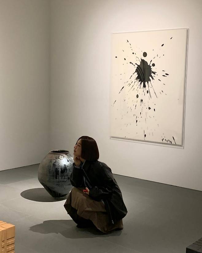 갤러리 공간에서는 오버사이즈 블랙 가죽 재킷과 롱스커트, 셔츠를 레이어드해 시크한 무드를 선보이고 있다. 차분한 컬러감과 여유로운 실루엣이 예술 작품과 조화를 이루며, 고급스러운 분위기를 연출한다. 바닥에 쪼그려 앉은 자세와 함께 자연스러운 포즈가 감각적인 이미지를 완성한다.