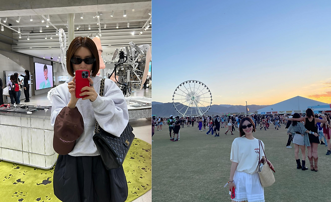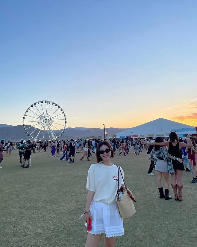 야외 페스티벌에서는 루즈한 화이트 반팔 티셔츠와 레이스 디테일의 화이트 쇼츠를 매치해 청량한 썸머룩을 연출하고 있다. 내추럴한 크로스백과 팔찌, 레드 컬러의 휴대폰 케이스가 포인트 역할을 하며, 자유롭고 경쾌한 분위기를 자아낸다.