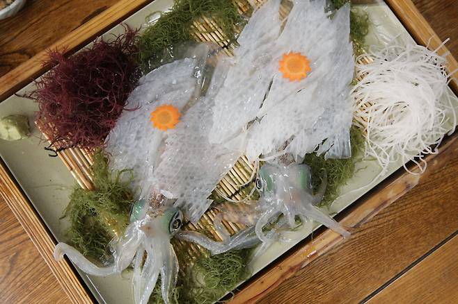 가라쓰에서 차로 약 40분 거리에 위치한 요보쿠항에서는 사가현의 명물 활오징어회를 맛볼 수 있어요.🦑 저희가 추천하는 식당은 가와타로 요부코점이에요. 오징어 모양 그대로를 유지한 채 나오는 활오징어회는 접시가 비칠 정도로 투명한 것이 특징이에요.🫢 또 쫀~득한 식감이 일품이라고. 오징어회를 다 먹고 나면 몸통과 다리는 튀김으로 나와요. 활오징어 정식은 1인 3,850엔으로 다소 비싸다고 생각할 수 있지만, 오징어회 한상을 먹고 나면 전혀 아깝다는 생각이 들 정도로 맛있으니까요.😋 사가현에 여행 가신다면 꼭 드셔보세요!