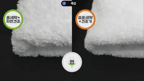 실제로 수건을 확대해서 보면, 자연건조를 했을 때는 수건의 실들이 뭉쳐지며 다소 거친 감이 있었는데, 건조기 사용 후에는 실이 뭉쳐있지 않고 한올한올 살아있었고, 촉감도 확실히 부드러웠습니다.