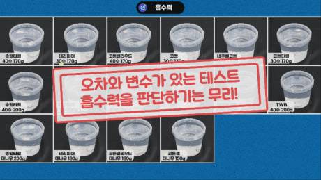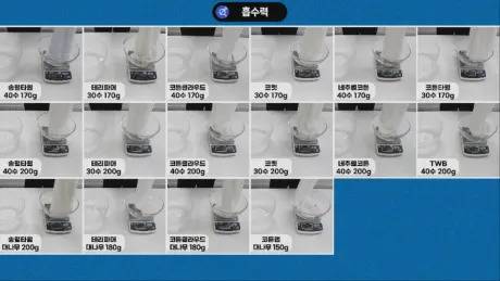 먼저, 흡수력을 비교하기 위해, 일부 브랜드에서 홍보하는 방식 중 하나인 수건 조각을 물에 넣어 얼마나 빨리 가라앉는지를 확인해 보았는데, 제품 간 차이가 크지 않았고 워낙 오차가 클 수밖에 없는 테스트라 흡수력을 비교하기에는 무리가 있다고 보여졌습니다.