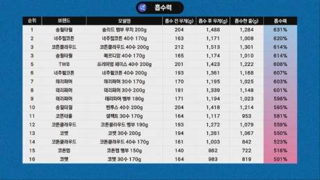 수건의 중량이 높을수록 더 많은 양의 물을 흡수했으며,수건 무게 대비로 보면 5~6배로 비슷한 수준이었는데, 송월타월 솔리드 뱀부가 6배 이상으로 가장 흡수력이 좋았으며, 코멧 30수 제품이 가장 흡수력이 낮았습니다.