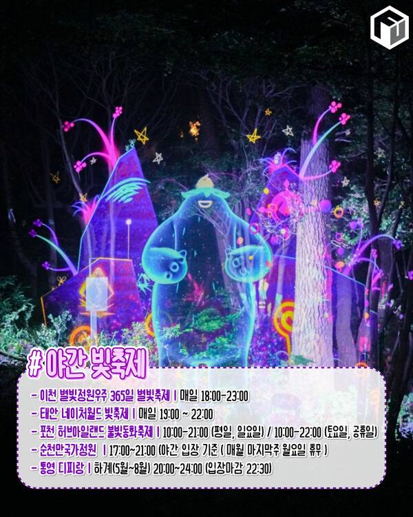 여름밤 반짝이는 야외 데이트를 즐길 수 있는 야간 빛축제입니다. 특별한 활동을 하지않더라도 걸으며 반짝이는 풍경을 만나볼 수 있어 여름철 야간에 즐기기 좋은 데이트코스인데요. 국내 곳곳에서 다양한 컨셉의 빛 축제들을 만나볼 수 있으니 연인과 함께 방문해보시길 바랍니다.
