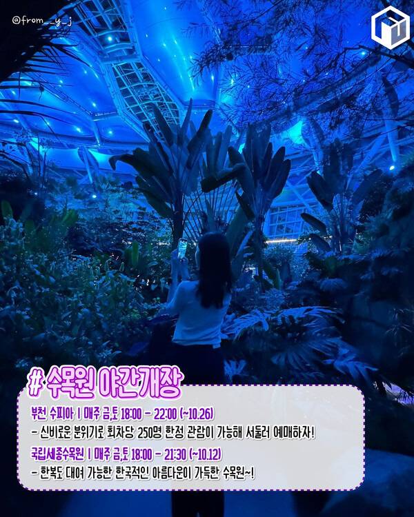 2곳 다 도심 속 수목원으로 접근성도 좋으며 야간개장으로 안 그래도 독특한 식물들이 신비로워보여 여름철 밤데이트코스로 추천드리는데요. 부천 수피아 수목원은 매주 금, 토 2일간 진행해 한 회차당 250명 한정으로 사전 신청으로 방문가능합니다.