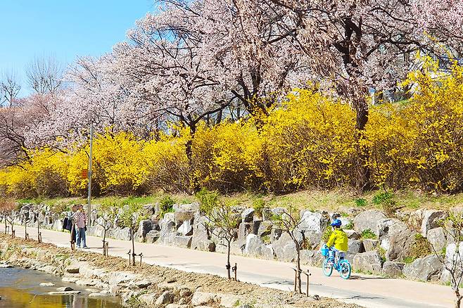 서울 동남권에서 개나리가 가장 먼저 피어나는 곳 중 하나로 손꼽히는 송파둘레길 성내천 구간. 이곳은 봄이면 양쪽으로 길게 늘어선 개나리 덤불이 장관을 이룬다.