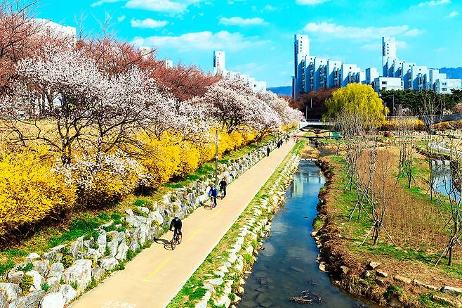 성내천을 따라 걷다 보면 발밑으론 잔잔한 물소리가 흐르고, 머리 위로는 노란 개나리가 하늘을 가득 메운다. 도심 속에서 이렇게 한적한 봄 산책을 즐길 수 있는 곳은 흔치 않다.