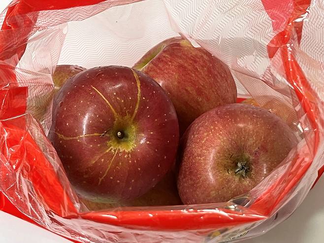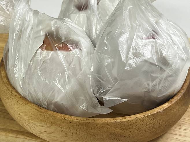 그다음 비닐봉지에 사과를 하나씩 넣습니다. 비닐봉지에 넣으면 외부 습기 유입을 막고 냉장고 냄새 등을 차단하여 신선하게 사과를 유지할 수 있습니다.