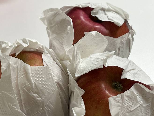 그리고 사과는 하나씩 키친타월로 감싸 주세요. 혹은 신문지도 좋습니다. 이 방법은 습기 조절과 곰팡이를 방지하여 사과가 빨리 무르는 것을 방지합니다.