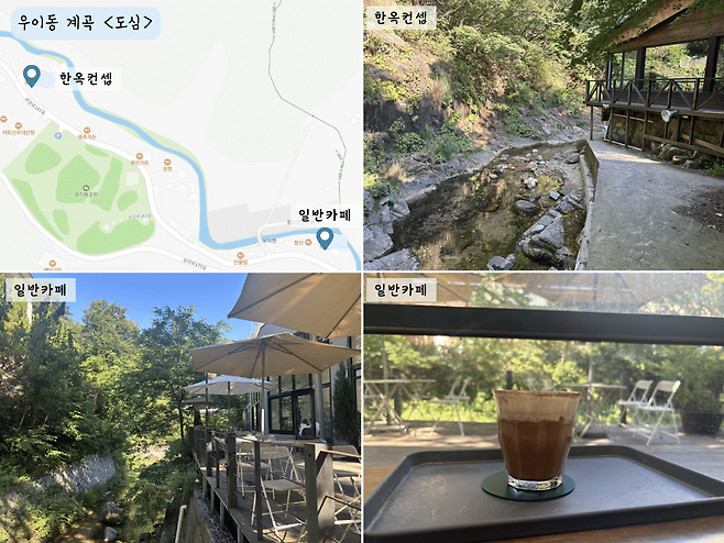 우이동 계곡 초입의 현대식 카페는 높은 층고와 세련된 외관, 탁 트인 야외좌석이 인상적이다. 특히 내부에서 계곡으로 바로 내려갈 수 있는 계단이 마련되어 있어, 방문객들은 음료를 즐기며 자연 속 발 담그는 여유를 만끽한다.