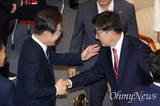 | ▲ 이재명 대통령이 26일 오전 서울 여의도 국회 본회의장에서 추가경정예산안(추경안) 시정연설을 마친 뒤 야당인 권성동 국민의힘 의원 등과 인사를 나누고 있다. |