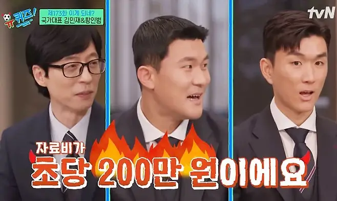 지난달 21일 공개된 tvN ‘유 퀴즈 온 더 블럭‘에 16강 주역인 한국 축구 국가대표 김민재, 황인범 선수가 출연했다. 진행자인 유재석은 경기 이야기를 들으면 당시 경기 장면이 들어가야 하는데 (월드컵 자료화면이) 초당 200만 원이라 선수들에게 직접 당시 상황을 재연해달라는 상황이 연출되었다. 이에 출연진뿐만 아니라 시청자들까지 놀라움을 감추지 못했다.