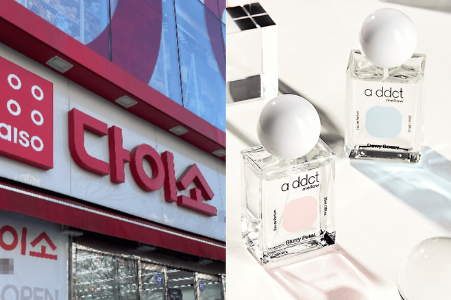 최근 뷰티 드럭스토어 시코르와 올리브영에서도 향 제품을 선보여온 브랜드 ‘에이딕트(a ddct)’가 다이소와 협업해 향수와 핸드크림을 출시했다. 특히 5,000원짜리 향수가 "명품 향수와 정말 비슷하다"는 후기가 이어지면서, 소비자층의 관심을 받게 되었다.