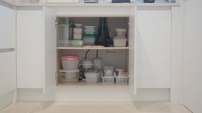 또 다른 활용법 하나 더 소개해 드릴게요! 여기는 다양한 식재료 보관용기를 수납하는 하부 수납장입니다.