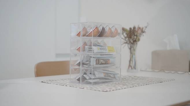 이렇게 커피나 차등 스틱들도 넣으면 딱 좋은 사이즈예요. 원래 이런 깔끔한 아크릴 정리함이 가격이 좀 있는 편인데, 이 다이소 수납함 가성비 정말 좋은 것 같아요. :