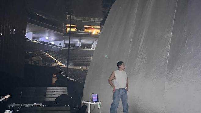 지난 25일 비는 자신의 SNS에 북미 공연 현장을 담은 여러 장의 사진을 게재했다. 공개된 사진 속 비는 거대한 무대 스크린에 상의 탈의 장면이 포착돼 시선을 압도했다.