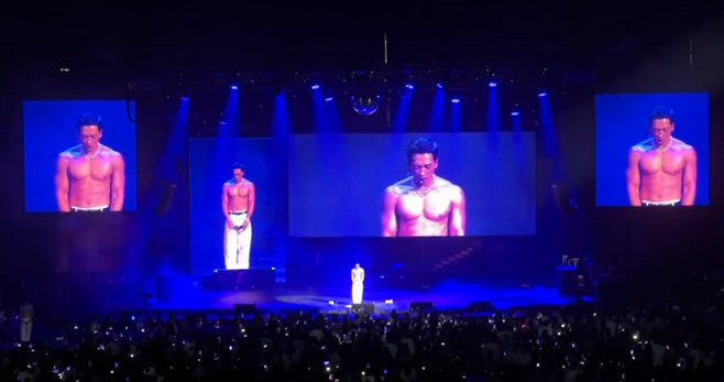 공개된 사진 속 비는 거대한 무대 스크린에 상의 탈의 장면이 포착돼 시선을 압도했다.