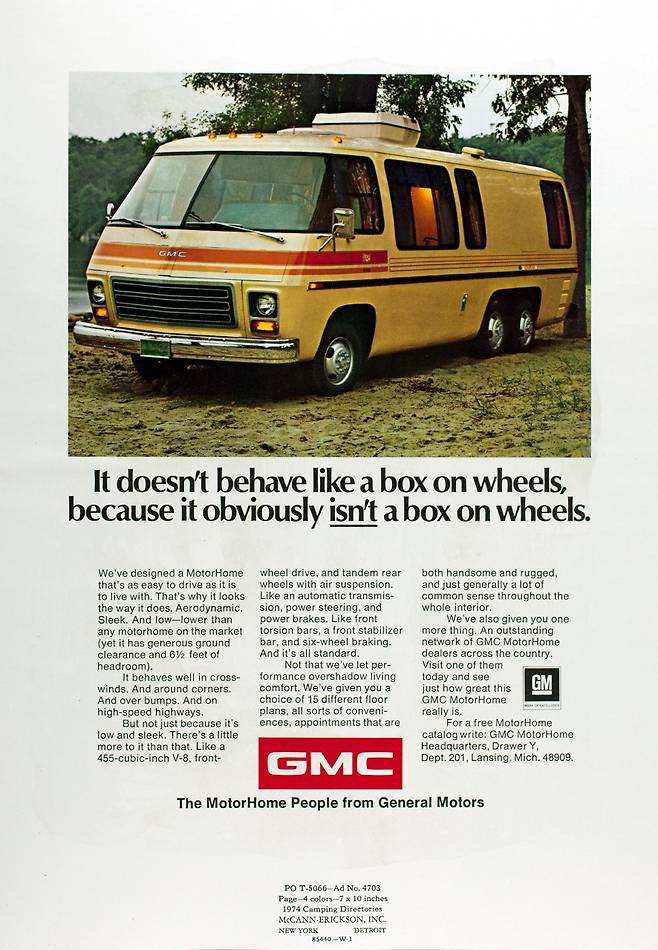 반세기가 지난 지금도 미국 도로 위를 달리고 있는 클래식 모터홈이 있다. 1973년부터 1978년까지 단 5년간 제너럴 모터스(GM)가 생산한 'GMC 모터홈(GMC Motorhome)'이 그 주인공이다. 총 12,921대가 생산된 이 차량은 현재도 약 70%에 해당하는 9,000여 대가 운행 중인 것으로 알려졌다.