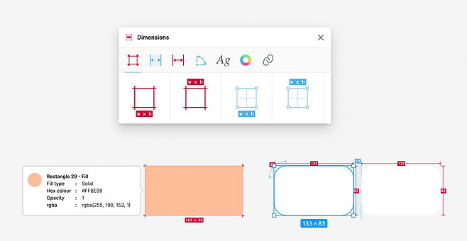 기본적인 기능은 간단합니다. 플러그인을 실행하면 다음과 같은 창이 뜨고, 원하는 내용을 선택하면 자동으로 주석이 표시됩니다. 개체의 높이와 너비, 개체 사이 간격, R값 등을 선택할 수 있고, 컬러값(opacity 포함)과 텍스트 프로퍼티도 클릭 한번으로 표기할 수 있답니다.