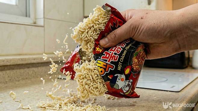 불닭볶음면을 봉지째 손으로 굵게 부순다. 너무 잘게 만들 필요는 없다. 한입에 들어갈 정도 크기로 고르게 깨지면 된다. 체에 한 번 털어 가루는 제거한다. 미세한 가루는 팬에서 먼저 타 쓴맛을 낸다.