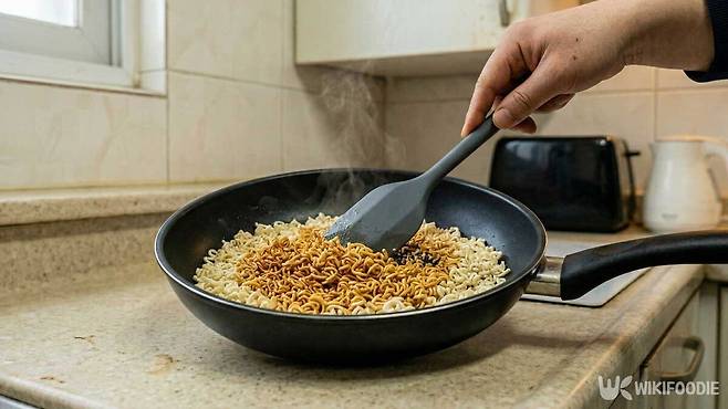 가스레인지에 프라이팬을 올리고 아무것도 두르지 않는다. 중불에서 부순 면을 펼쳐 넣는다. 3~4분 정도 천천히 볶는다. 계속 뒤적이기보다 한쪽 면이 살짝 노릇해질 때까지 두는 편이 고소한 향을 살리기 좋다.