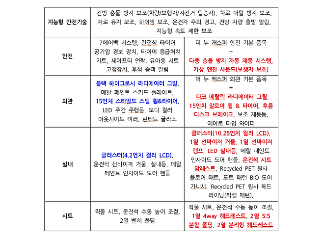 실내에선 클러스터의 크기가 다른데요. 더 뉴 캐스퍼에서 가장 높은 등급까지 4.2인치로 고정된 클러스터가 캐스퍼 일렉트릭에선 10.25인치로 커집니다. 캐스퍼 일렉트릭엔 운전석뿐만 동승석에도 선바이저 거울과 램프도 있습니다. 실내등도 LED. 시트 소재는 같지만 캐스퍼 일렉트릭의 1열 시트의 헤드레스트는 높이, 전후 위치 조절이 가능합니다. 2열 헤드레스트도 분리가 가능하고 5:5로 나누어 부분 폴딩이 됩니다. 내연기관 모델에서 2열 분리형 헤드레스트와 5:5 분할 폴딩 기능은 디 에센셜부터 적용됩니다.