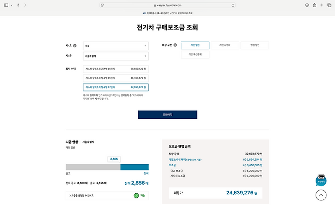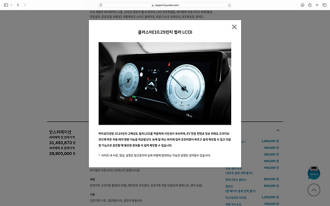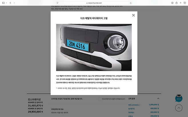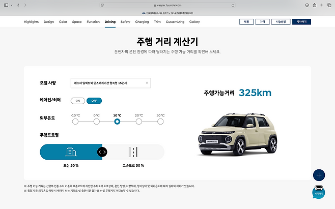 캐스퍼 일렉트릭 프리미엄의 판매 가격은 세제혜택 적용 기준 2740만 원입니다. 국고 보조금 520만 원과 지자체 보조금을 받으면 지역에 따라 1천만 원 대로도 구매가 가능할 수 있다는 게 현대차의 설명입니다.