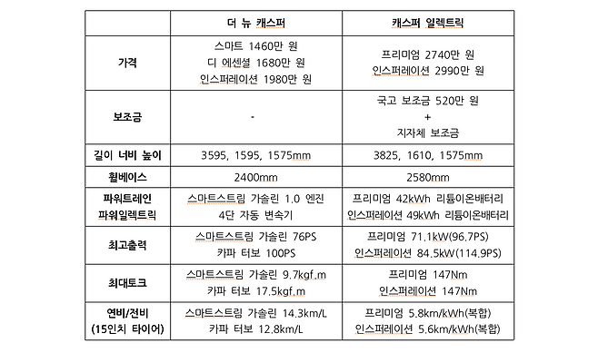 캐스퍼 일렉트릭은 기본형부터 구성이 더 나아 보이긴 합니다. 프리미엄(2740만 원)과 인스퍼레이션(2990만 원)의 가격 차이는 250만 원. 그 차이는 배터리 용량, LED 방향지시등, 보디 컬러 아웃사이드 미러, 천연 가죽 스티어링 휠, 앰비언트 무드램프, 인조가죽 시트, 1열 열선 시트, 운전석 통풍 시트, 세이프티 파워 윈도 등등. 가장 큰 건 주행 거리겠죠.