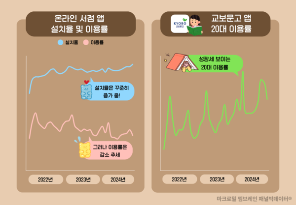 주요 온라인 서점 애플리케이션(예스24, 교보문고, 알라딘, 영풍문고)의 설치율이 전반적으로 상승하며 독서에 대한 관심을 반영하고 있지만, 설치율 증가에 비해 이용률은 감소세를 보여 대조적인 양상을 드러내고 있다.