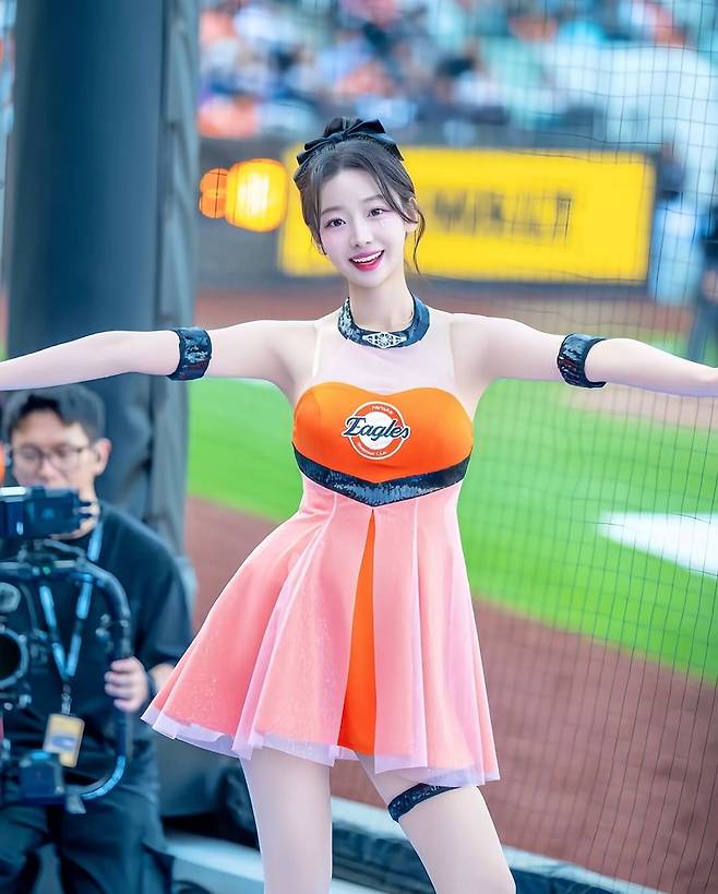 한화이글스의 9연승이라는 대기록만큼이나 뜨거운 열기가 감도는 경기장에서, 우수한은 오렌지와 핑크의 조화가 인상적인 드레스로 등장했다. 상의는 튜브탑 스타일의 밝은 오렌지 컬러로, 중앙에는 한화이글스를 상징하는 로고가 큼직하게 자리잡았다. 여기에 블랙 시퀸 벨트 디테일이 허리 라인을 슬림하게 잡아주며 전체 실루엣에 세련된 무드를 더했다.
