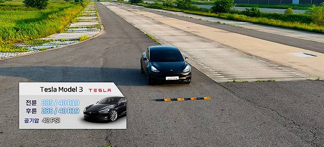 테스트를 위한 전기차는 테슬라의 모델 3다. 다른 전기차를 사용하는 것도 방법이지만 일부 전기차는 주행 성능에 한계가 있어 타이어 제조사들도 제품 개발에 활용하지 않는다. 반면 테슬라는 다수의 타이어 제조사들이 시험용 차로 운영한다. 시험 규격은 235/40 R19이다.
