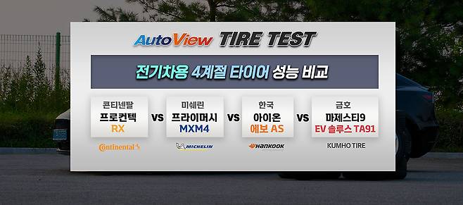 오토뷰는 확대되는 전기차 시장을 감안해 전기차 타이어를 비교 테스트했다. 시장 성격에 맞춰 여름용이나 겨울용이 아닌 4계절용 타이어 그룹으로 묶었다.
