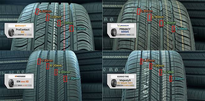 트레드 홈 깊이도 확인했다. 여기서 주의가 필요한데, 홈 깊이가 타이어의 내구성을 의미하지는 않기 때문에 참고 수치로만 봐야 한다. 확인 결과 한국이 가장 깊은 8mm 내외의 중앙부 홈을 갖고 있었고, 다음은 금호, 콘티넨탈 순이었습니다. 금호와 콘티넨탈은 거의 유사하다고 보면 된다. 미쉐린은 홈이 6mm 대 후반으로 가장 얇은 편이었다.