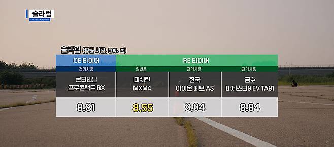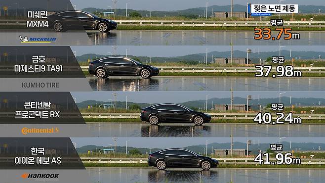 미쉐린 프라이머시 MXM4가 평균 8.5초대로 가장 빠른 성능을 냈다. 나머지 타이어들은 8.8초를 중심으로 오차 범위 내에서 유사 성능을 보였다.