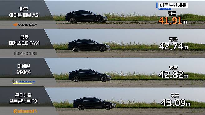 젖은 노면 성능을 확인했으니 마른 노면 제동 성능도 보자. 시속 100km의 속도에서 완전히 정지할 때까지 이동한 거리에서 한국타이어 아이온 에보 AS가 가장 앞선 기록, 짧은 제동거리를 보였다. 유일하게 평균 41m 대를 기록한 것. 금호 마제스티 9 EV와 미쉐린 프라이머시 MXM4는 42m 중후반을 기록했으며, 콘티넨탈 프로콘택트 RX만 유일하게 43m대로 밀려났다.