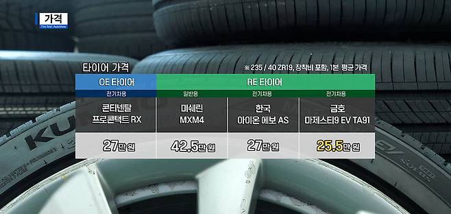 한국 아이온 에보 AS와 콘티넨탈 프로콘택트 RX는 같은 수준인 평균 27만 원대에 팔리고 있었다. 금호 마제스티 9 EV는 이들보다 1~2만 원 낮은 수준으로 거래되어 가격 경쟁력에서 앞섰다. 다른 타이어는 문제없었지만 미쉐린은 가격 차이가 너무 커서 이 항목에서 점수를 많이 잃었다.