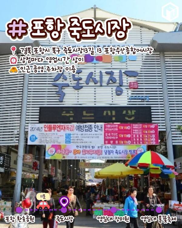 포항을 대표하는 시장인 죽도시장은 포항 죽도 시장은 횟집 200여 개가 밀집되어 있는 만큼 수산물과 건어물이 유명한데요. 이외에도 농산물, 잡화, 의류, 문구, 길거리 음식 등 볼거리가 많은 전통시장입니다.