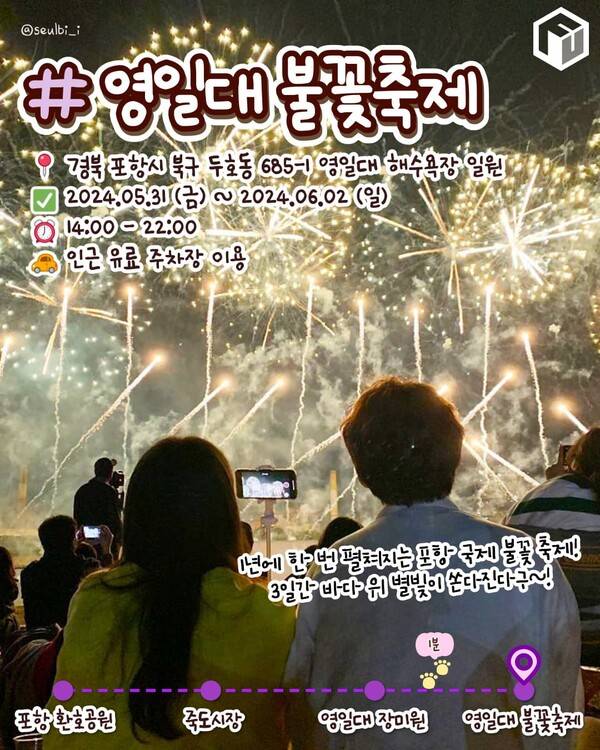 우리나라 3대 불꽃축제라고 불리는 포항 불꽃축제가 평년보다 이른 5월 31일 금요일부터 6월 2일 일요일까지 포항 영일대 해수욕장 일원에서 펼쳐집니다. 영국과 호주, 중국 등 3개의 불꽃 공연팀이 선사하는 불꽃공연은 6월 1일 오후 9시부터 진행됩니다.