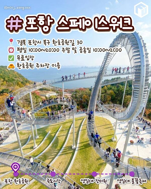 마치 롤러코스터같은 스페이스워크는 아찔한 계단을 따라 오르면 영일만, 영일대해수욕장, 포항 제철소 등 포항의 경치를 360도로 조망할 수 있고 밤에 방문하면 조명과함께 야경도 즐길 수 있어 포항 1박 2일 여행코스 첫번째로 추천드리는 곳입니다.
