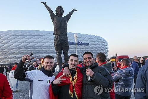epa12018577 Inter Milan supporters are seen in front of Gerd Mueller statue at Allianz Arena ahead of the UEFA Champions League quarter final 1st leg between FC Bayern Munich and Inter Milan in Munich, Germany, 08 April 2025. EPA/FILIP SINGER