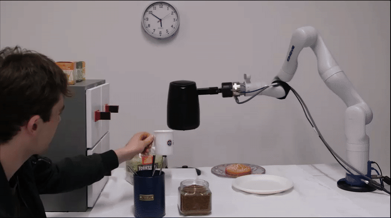 컵을 꺼낸 로봇은 티스푼으로 커피 가루를 넣은 뒤 포트기를 집어 들었다. 로봇은 컵의 위치를 확인한 뒤 적정한 양의 물을 부었다. 연구진은 로봇이 작동하는 동안 누군가 머그잔을 부딪히거나 움직이는 경우에도 대처가 가능하다고 했다.