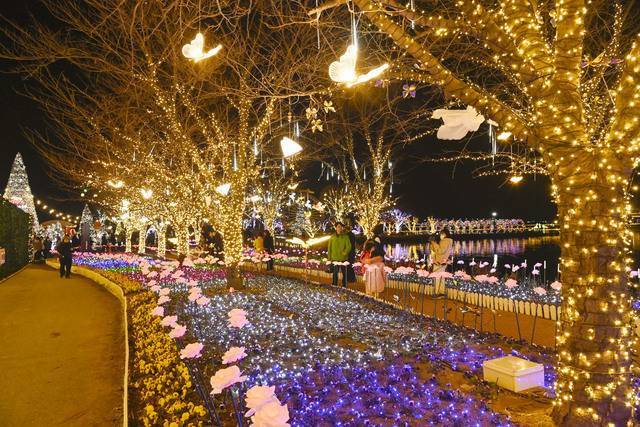 공원 중앙에는 높이 약 10m의 대형 트리 1기와 8m 규모의 트리 3기가 설치되어 겨울밤의 중심 풍경을 만들고, 입구에는 산타 인형과 가로등 조형물이 배치돼 방문객을 맞이합니다. 낮에는 조용한 호수 공원이지만, 해가 지면 전혀 다른 공간처럼 느껴지는 것이 인상적입니다.