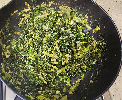 ✔️ 볶기팬에 들기름을 두르고 마늘을 볶은 후, 시래기를 넣고 2~3분 볶아줍니다.